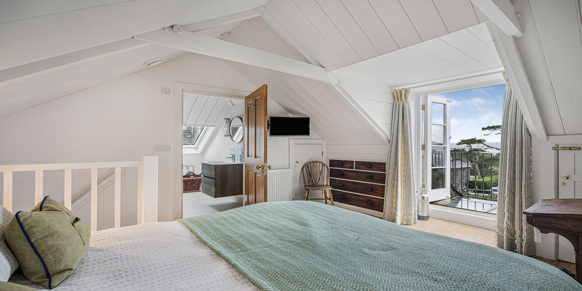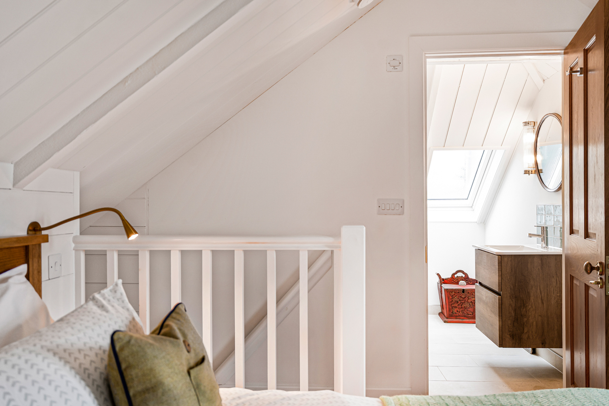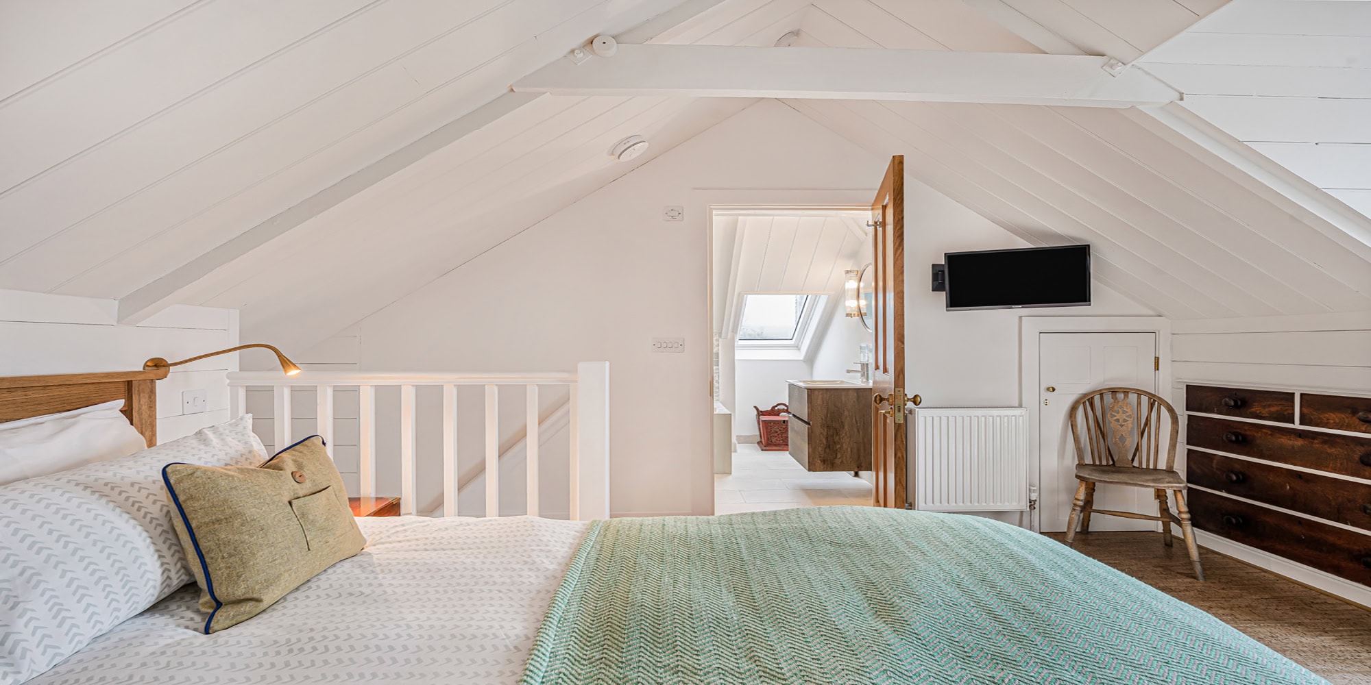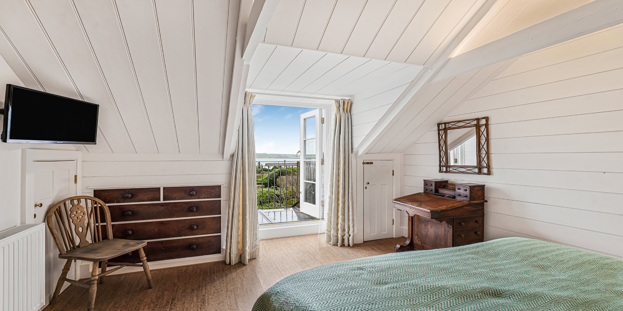The top floor is home to a delightful Hamptons-style bedroom with a double bed, small wall-mounted smart TV, and an ensuite with large bath and shower attachment. The real showstopper is the far-reaching sea view, best enjoyed from the private balcony.