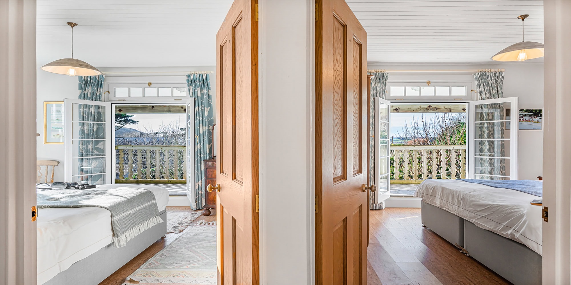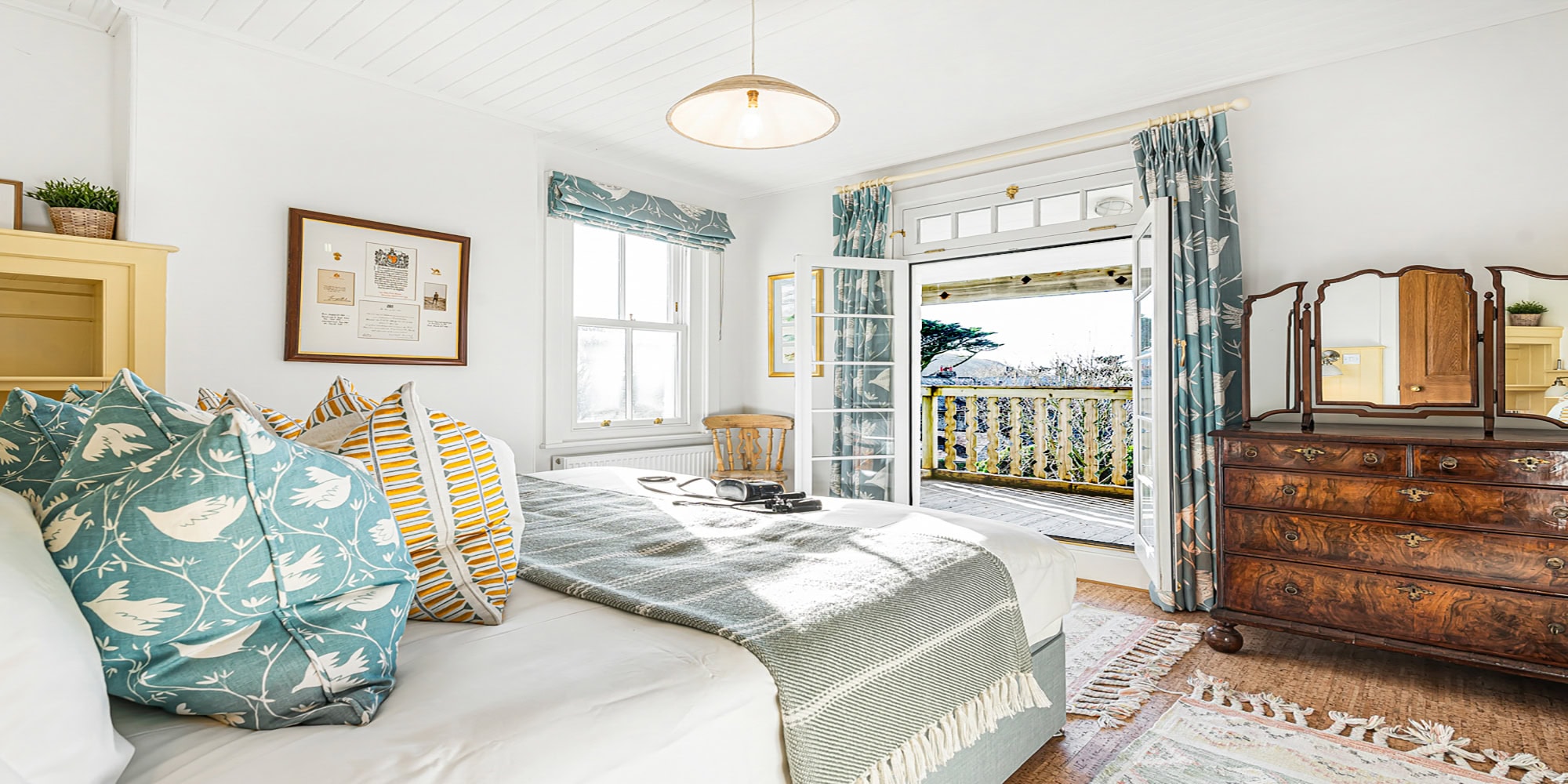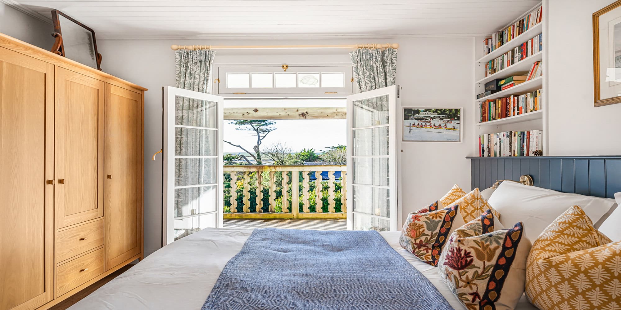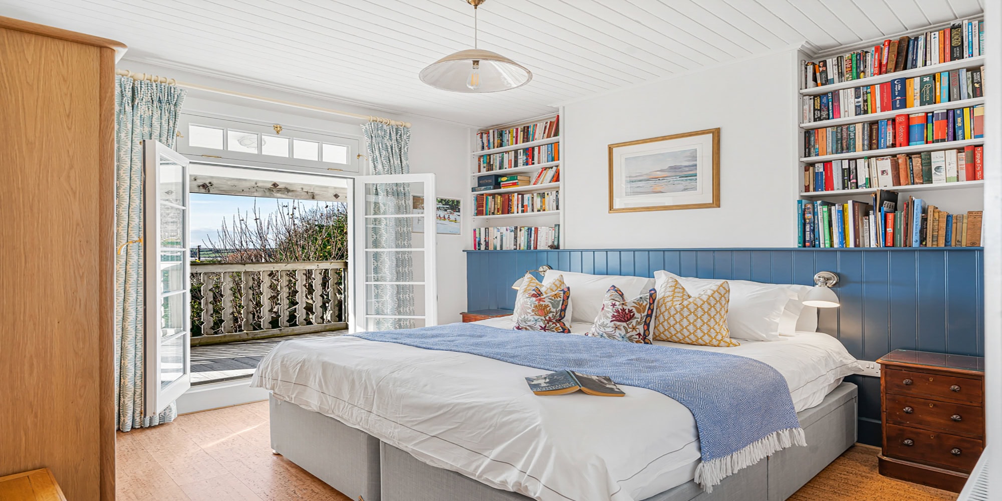 The top floor is home to a delightful Hamptons-style bedroom with a double bed, small wall-mounted smart TV, and an ensuite with large bath and shower attachment. The real showstopper is the far-reaching sea view, best enjoyed from the private balcony.