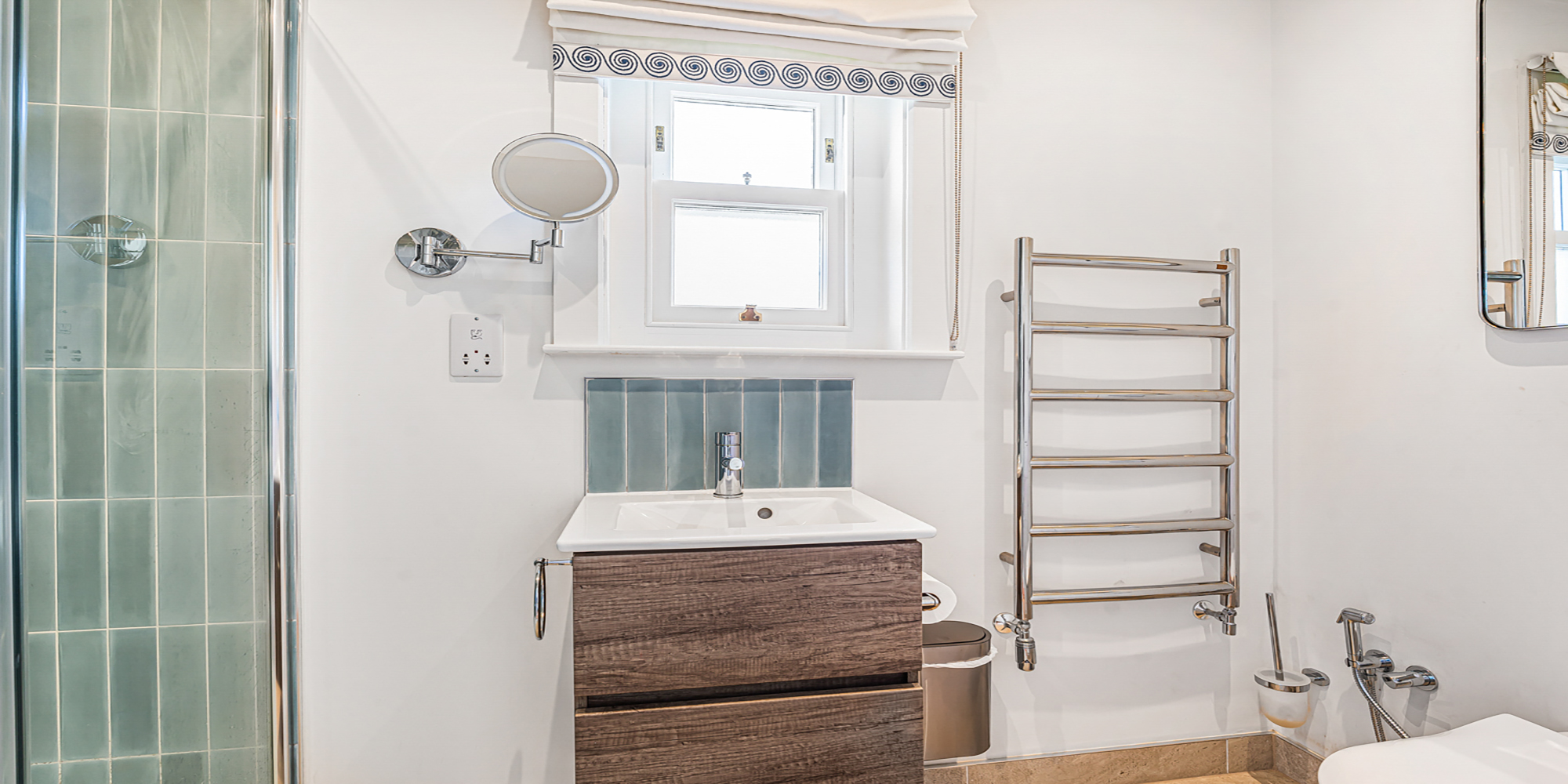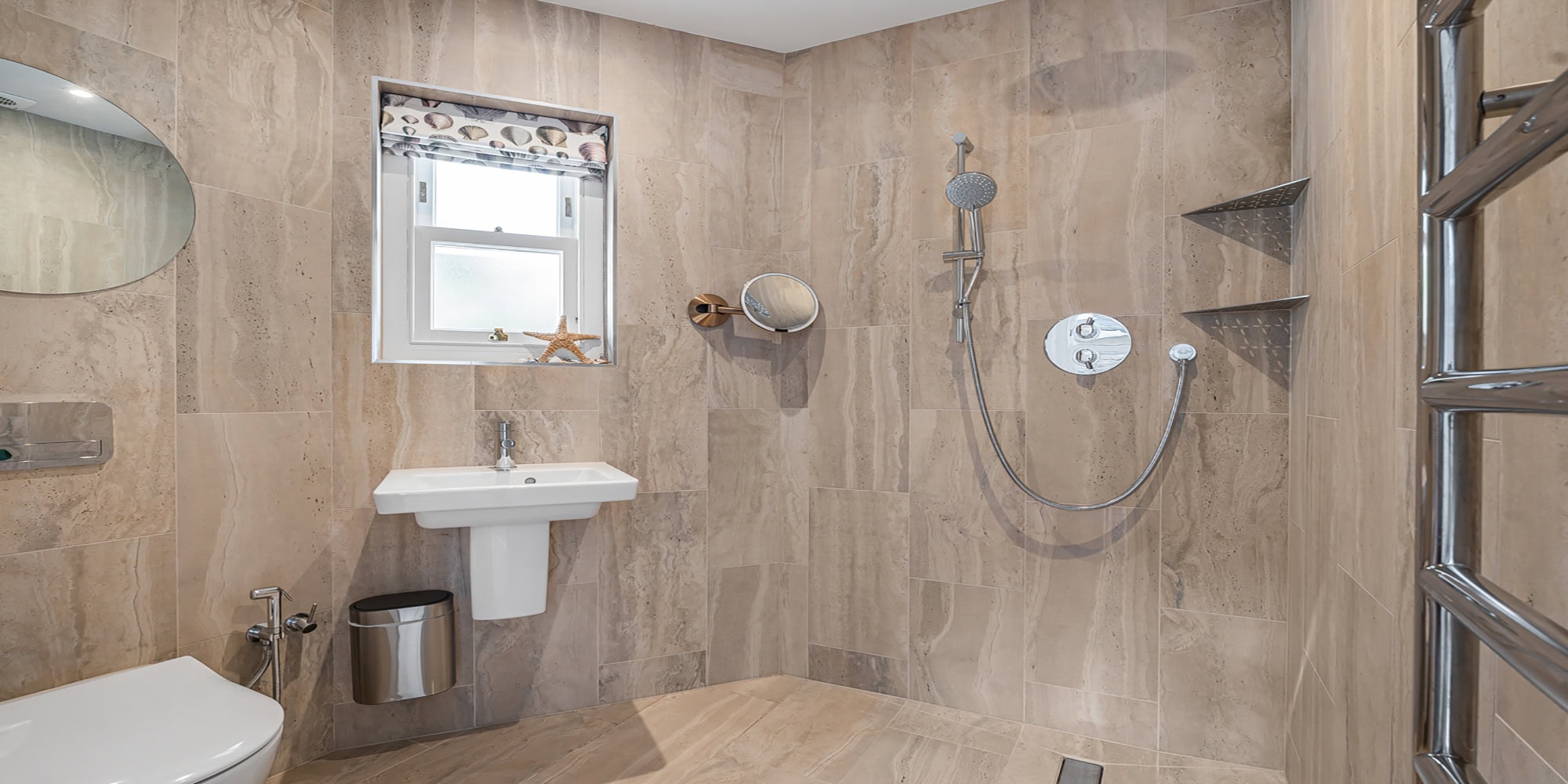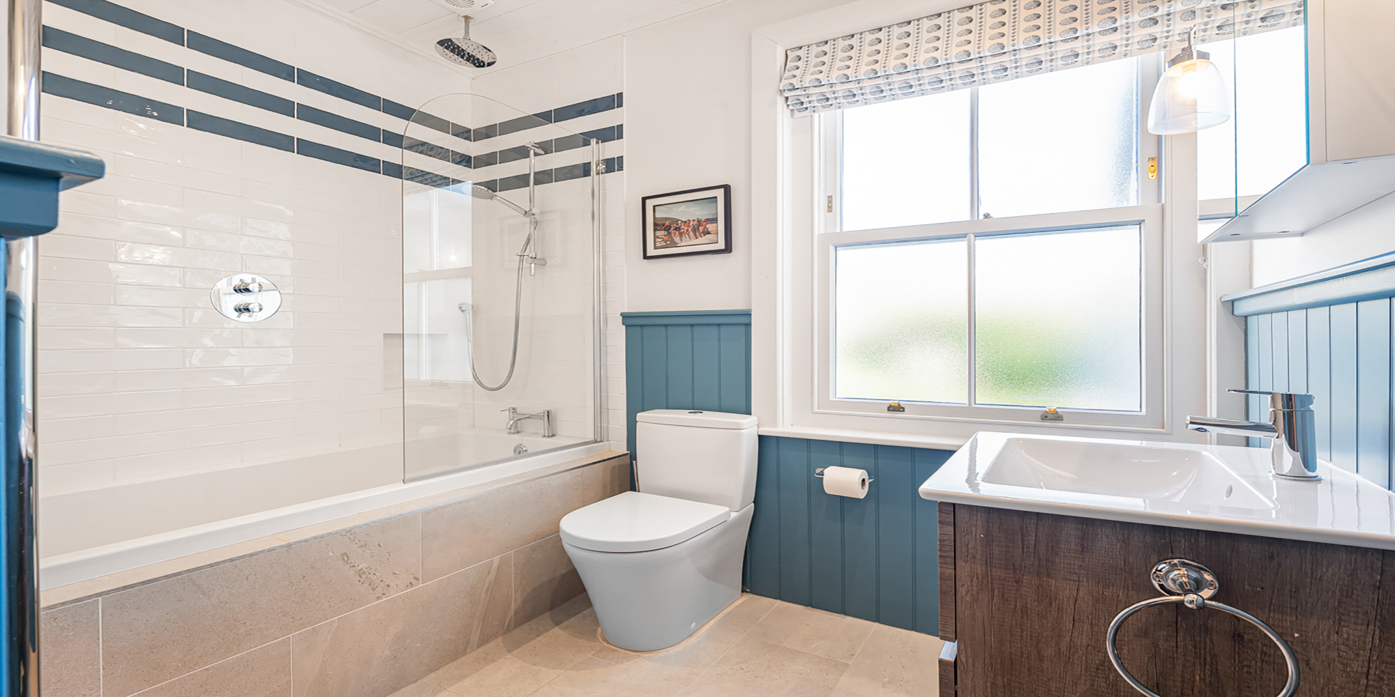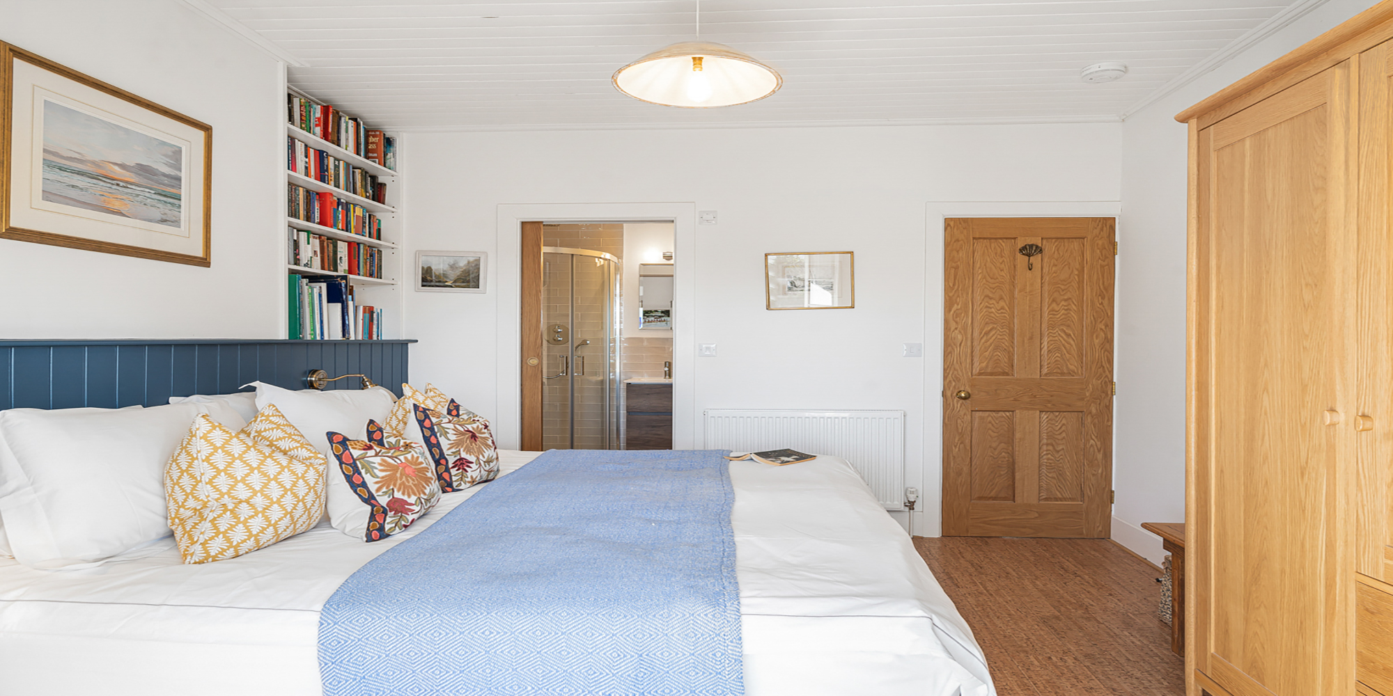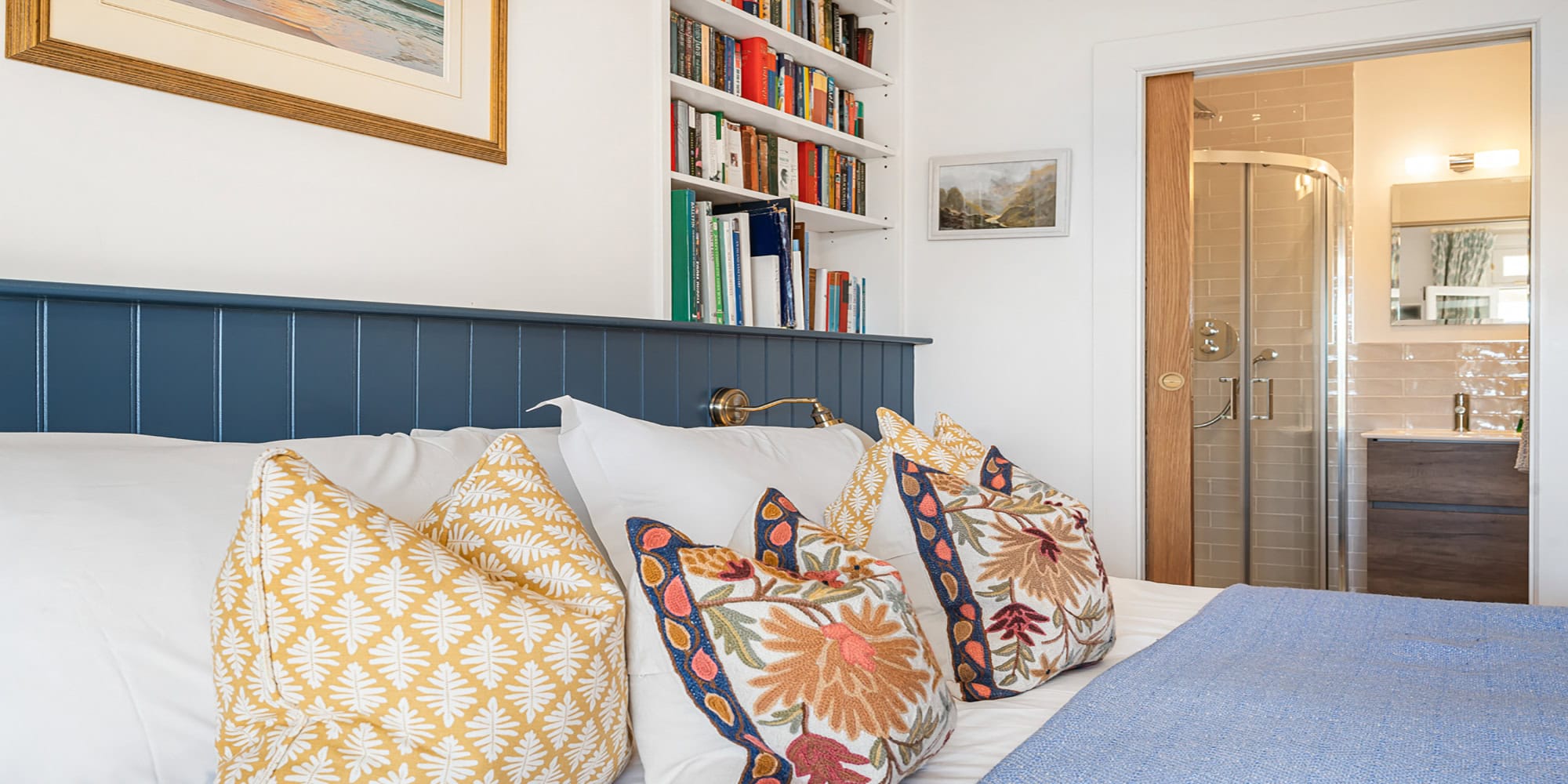 The top floor is home to a delightful Hamptons-style bedroom with a double bed, small wall-mounted smart TV, and an ensuite with large bath and shower attachment. The real showstopper is the far-reaching sea view, best enjoyed from the private balcony.