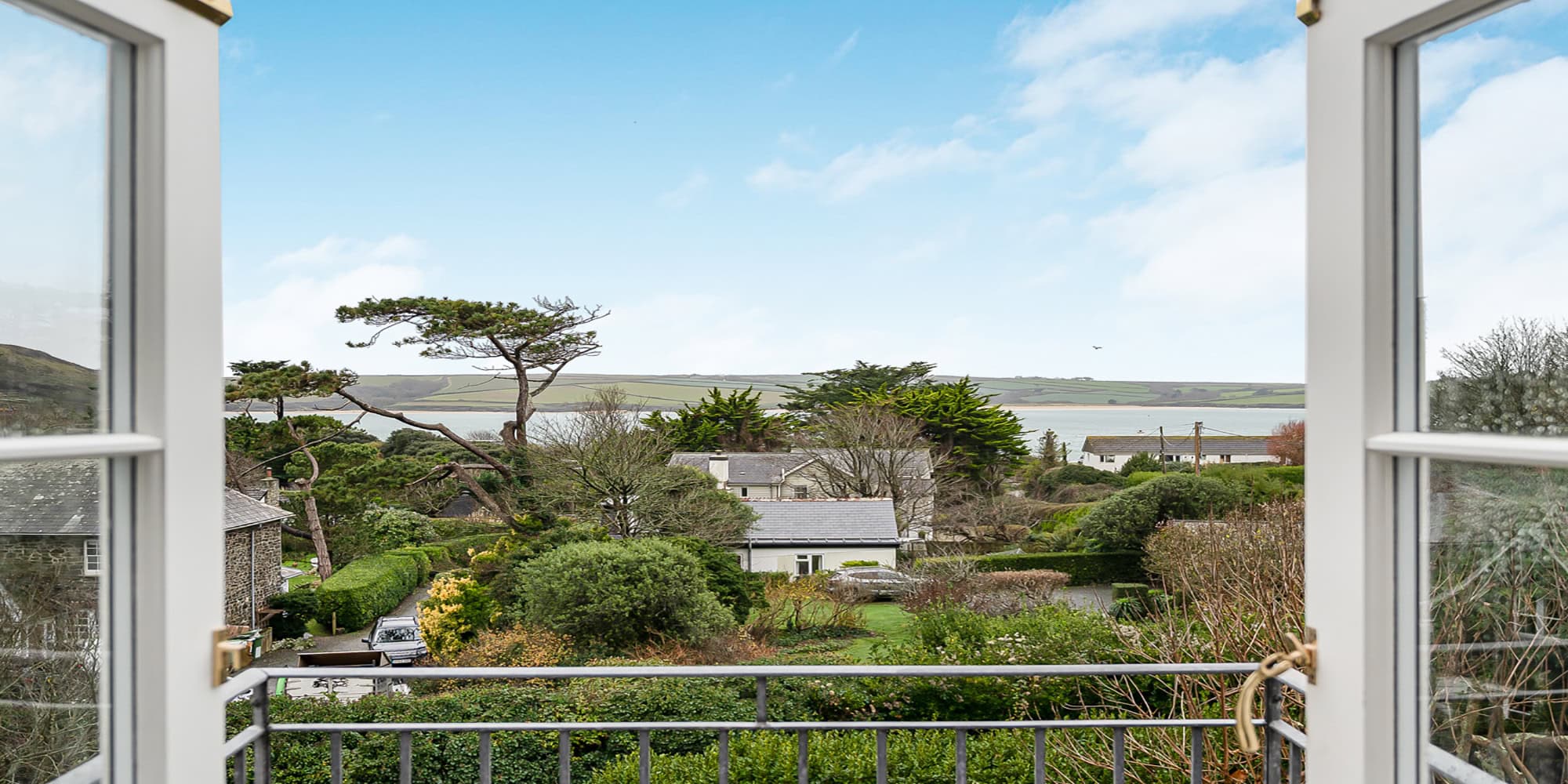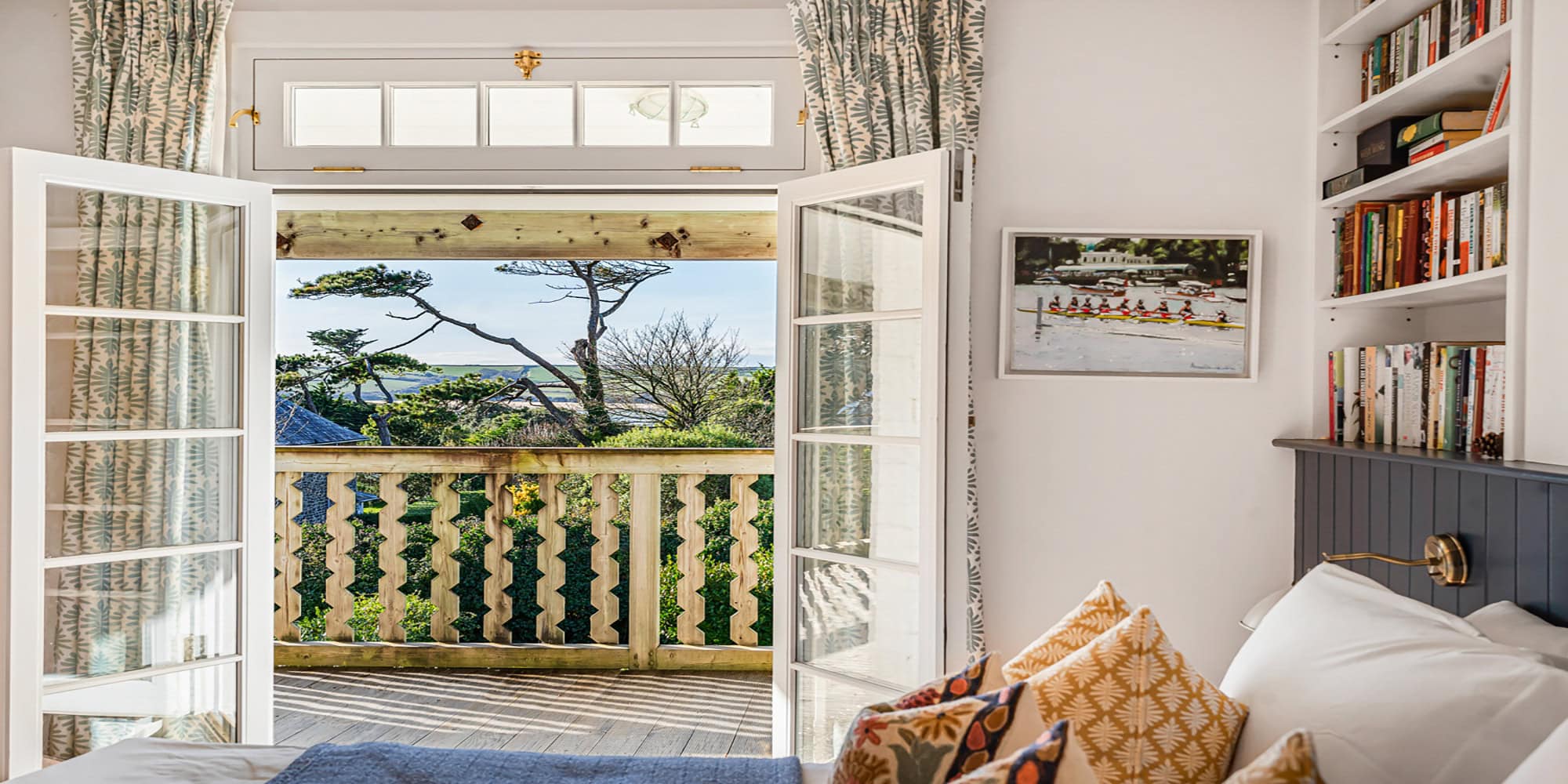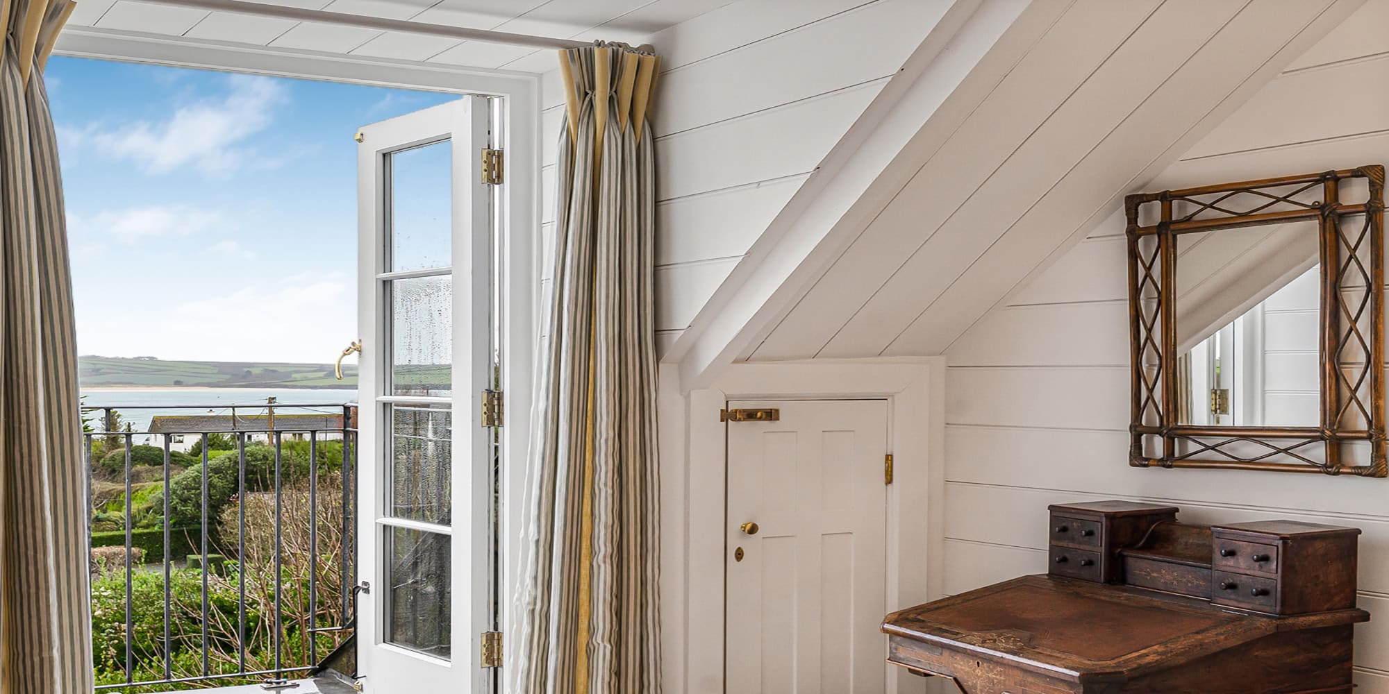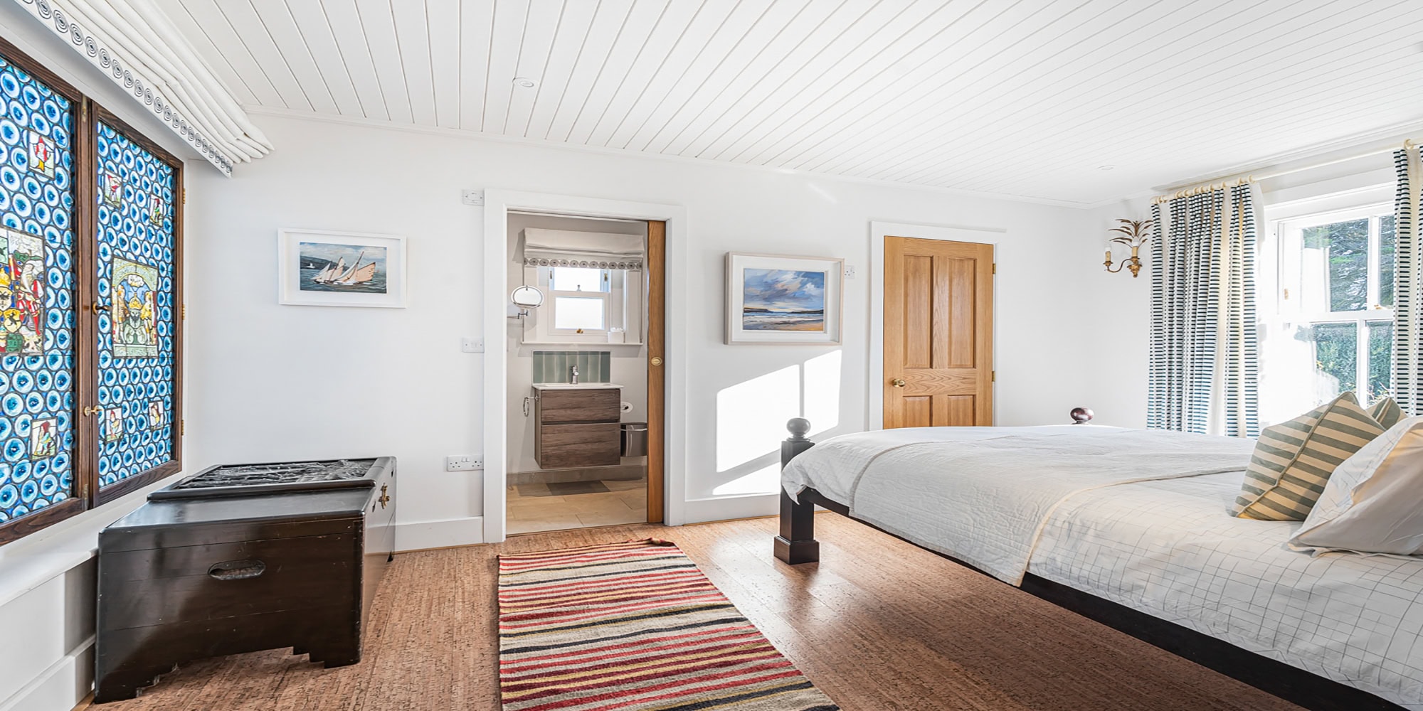 On the first floor sit four of the five well-presented bedrooms. At the front of the house, facing west, are two generously sized bedrooms – one a lavish ensuite – both boasting stunning views across the Camel Estuary and veranda access via French doors. Each has a zip-and-link bed, which can be arranged as two singles or a luxurious super king. There’s also a kids’ room with a triple bunk, and a further double room with its own ensuite, garden views and a unique stained-glass window. The charming family bathroom, with large bath and shower over, is also on this floor.
