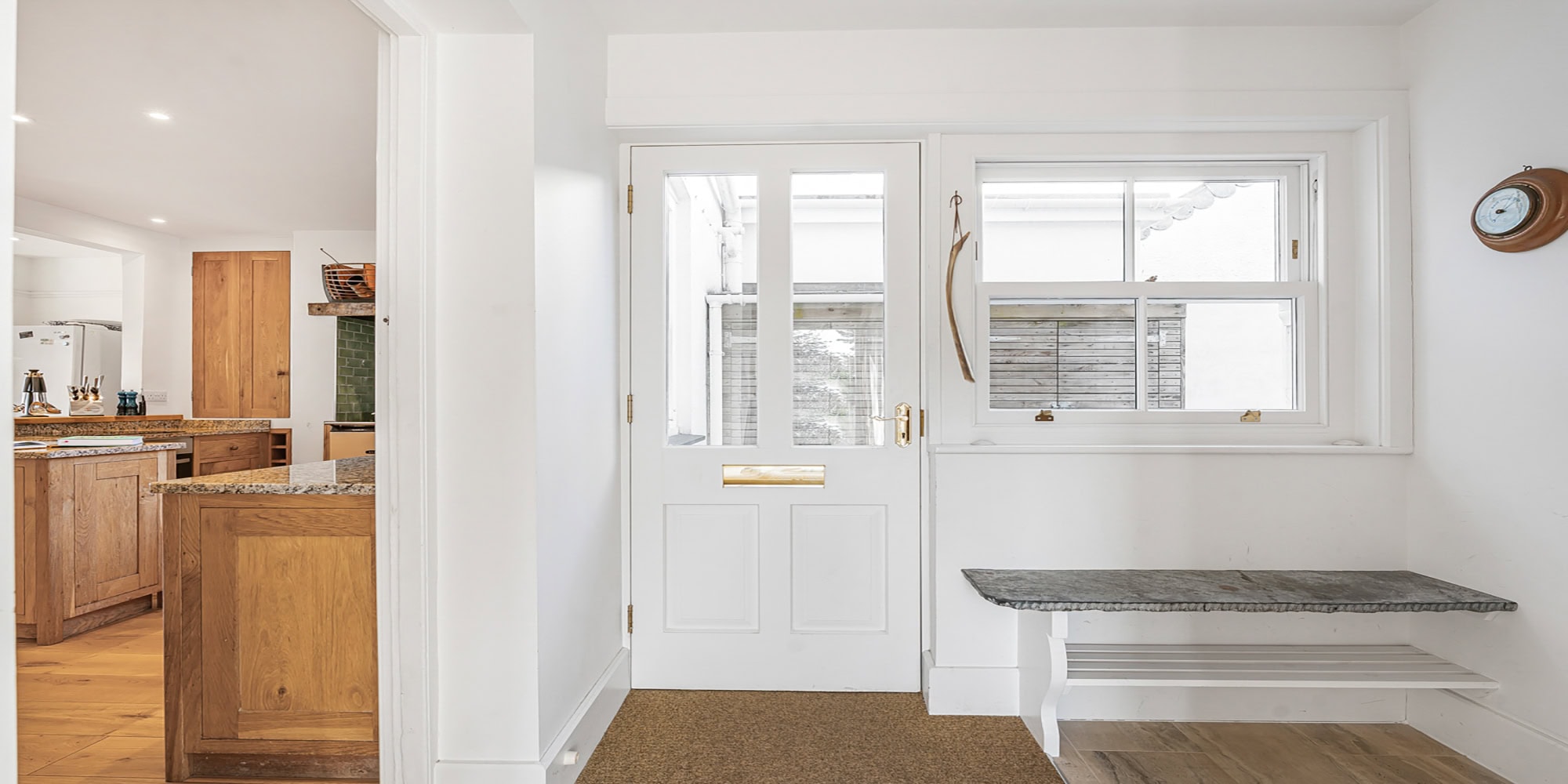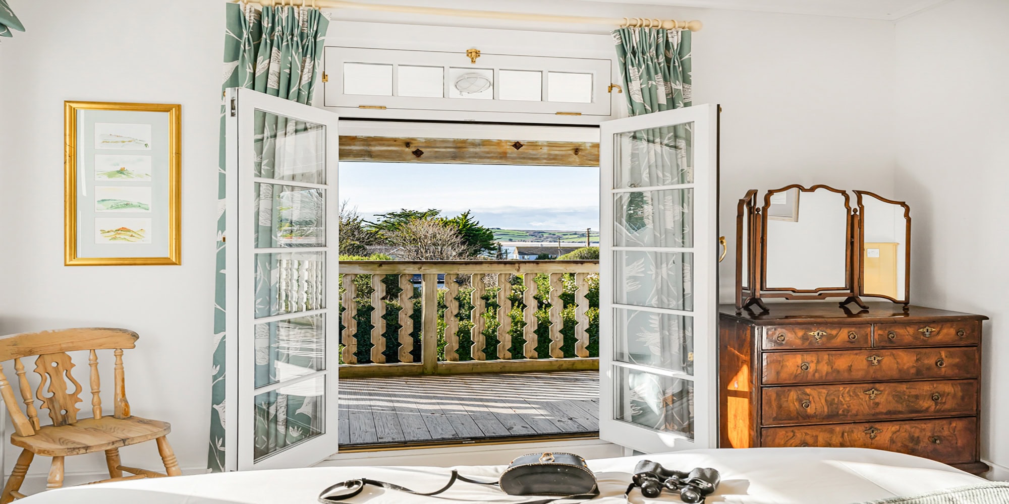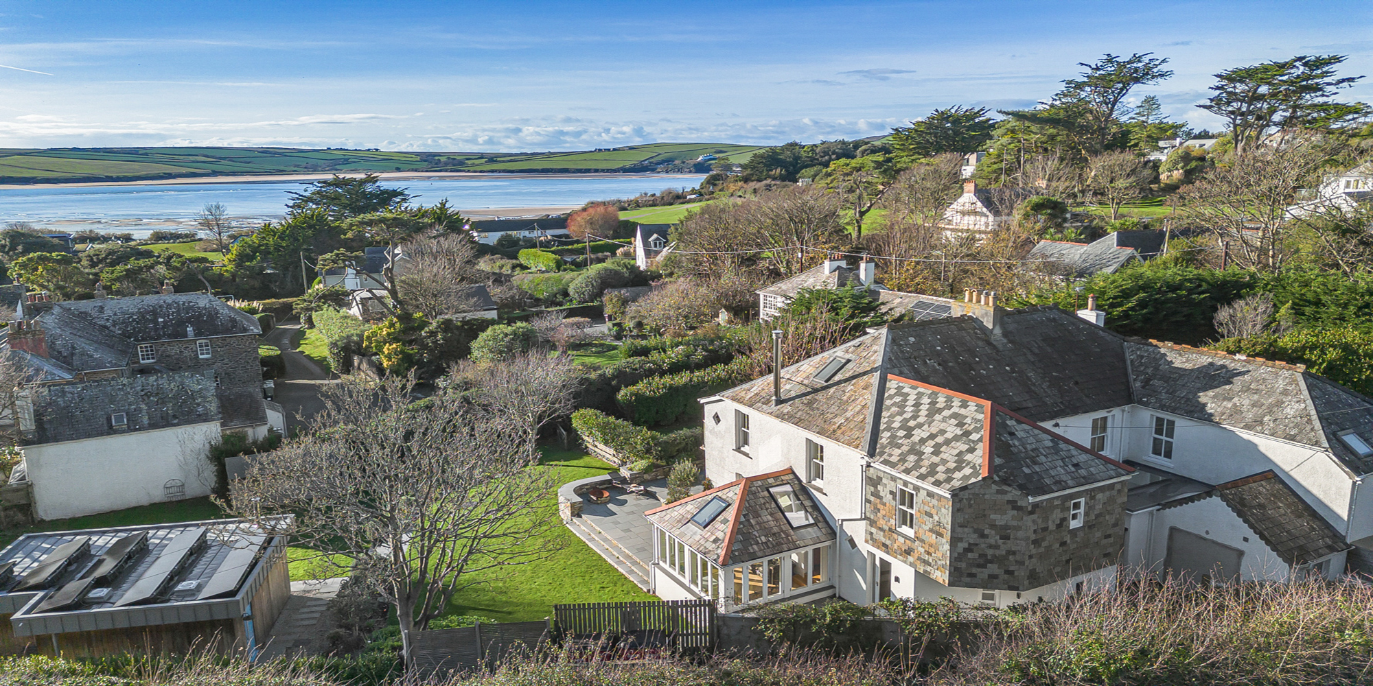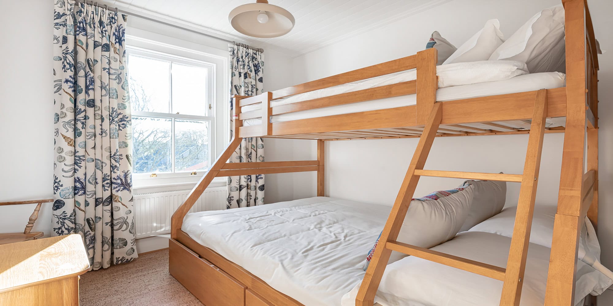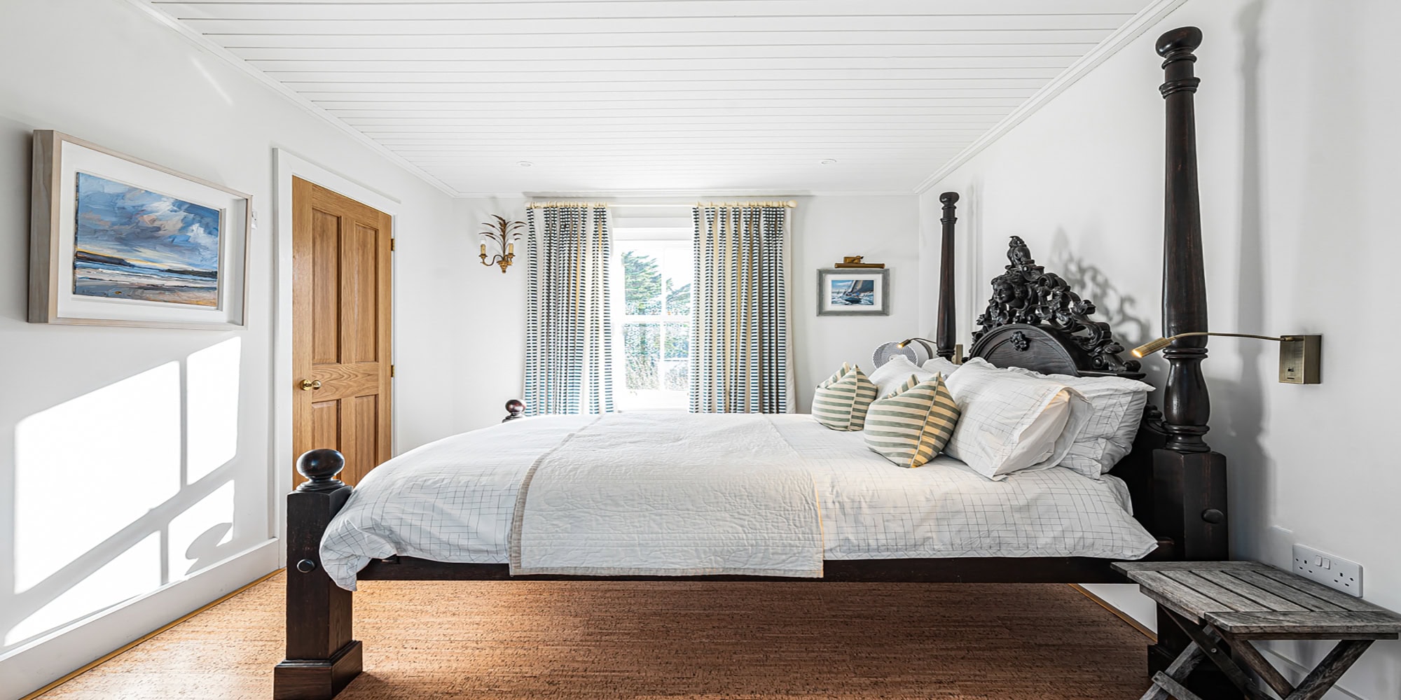 On the first floor sit four of the five well-presented bedrooms. At the front of the house, facing west, are two generously sized bedrooms – one a lavish ensuite – both boasting stunning views across the Camel Estuary and veranda access via French doors. Each has a zip-and-link bed, which can be arranged as two singles or a luxurious super king. There’s also a kids’ room with a triple bunk, and a further double room with its own ensuite, garden views and a unique stained-glass window. The charming family bathroom, with large bath and shower over, is also on this floor.